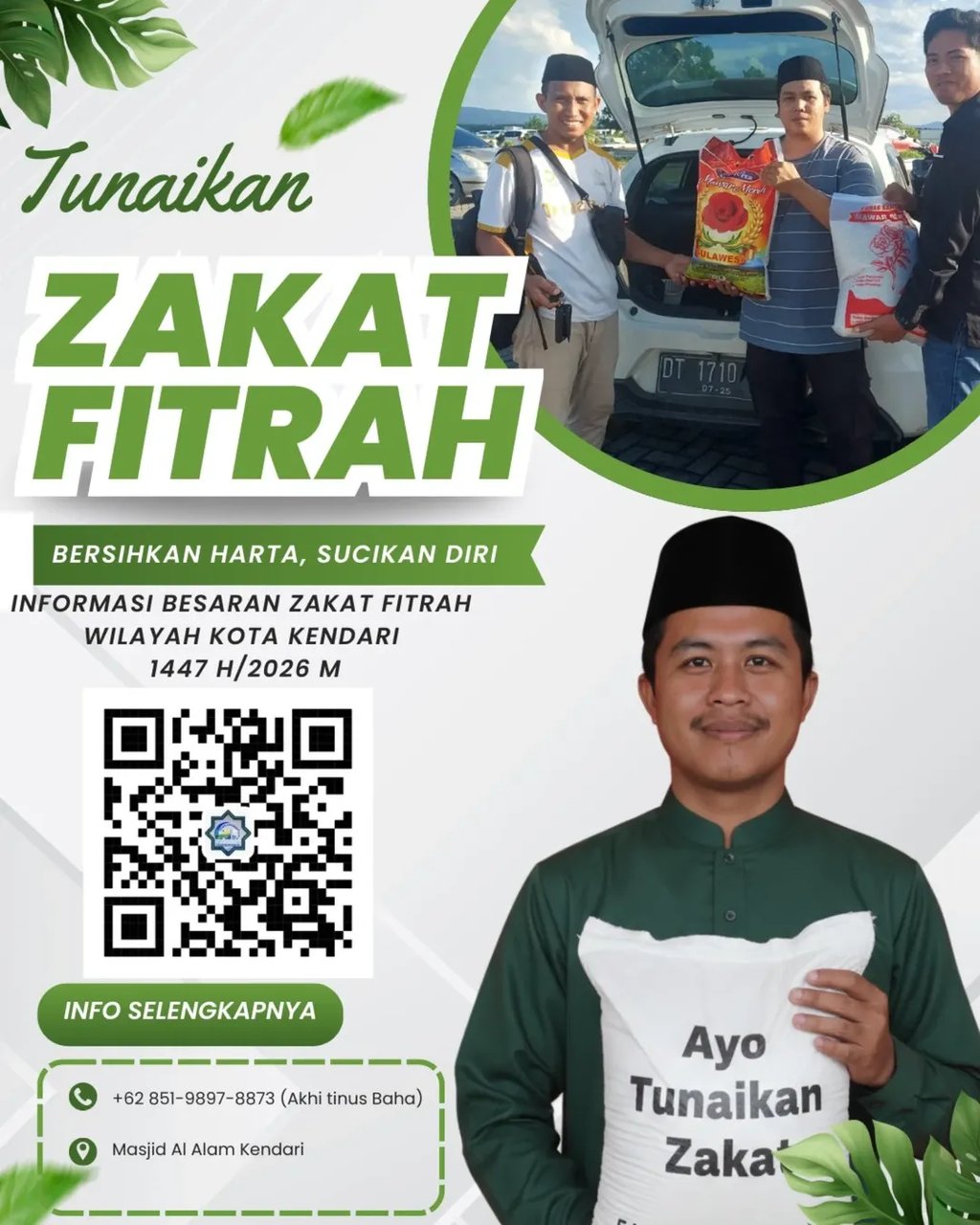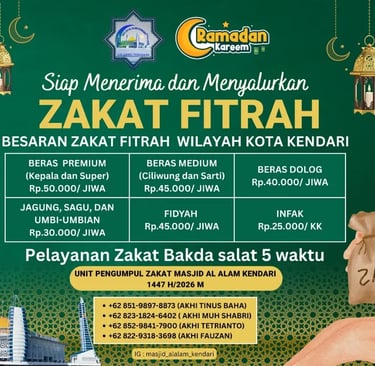 Assalamu’alaikum, warga Kota Kendari. Sudahkah Anda menyiapkan zakat fitrah tahun ini? Unit Pengumpul Zakat (UPZ) Masjid Al Alam Kendari siap menerima dan menyalurkan zakat Anda kepada yang berhak.