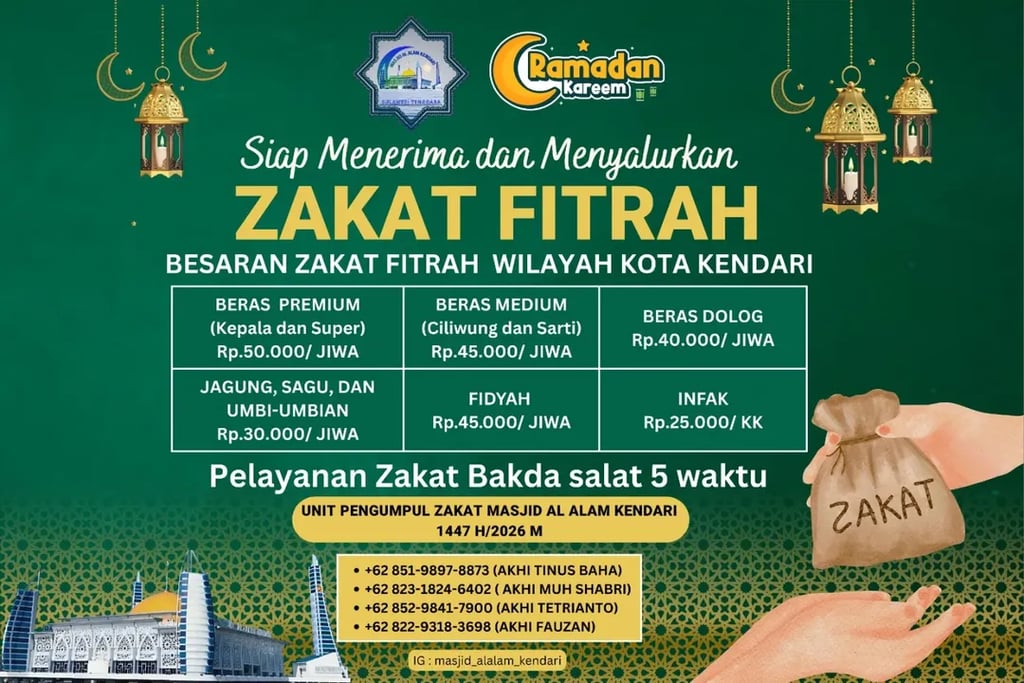 Berikut rincian Besaran Zakat Fitrah 1447 H / 2026 M untuk wilayah Kota Kendari: